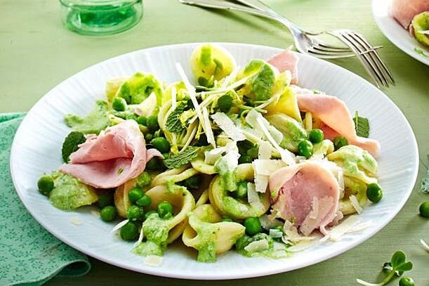 Frühlingspasta mit Erbsen & Schinken (ganz einfach) Zubereitungszeit: 25 Minuten Rezept für 4 Personen  Zutaten 200 g  tiefgefrorene Erbsen 400 g  Nudeln (z. B. Orecchiette) Salz  & Pfeffer 5–6 Stiel(e)  Minze 150 g  Ricottakäse 1–2 EL  Zitronensaft 1/4   Beet Kresse 25 g  Spargelsprossen  (falls vorhanden) 50 g  Parmesankäse 75 g  gekochter Schinken in dünnen…